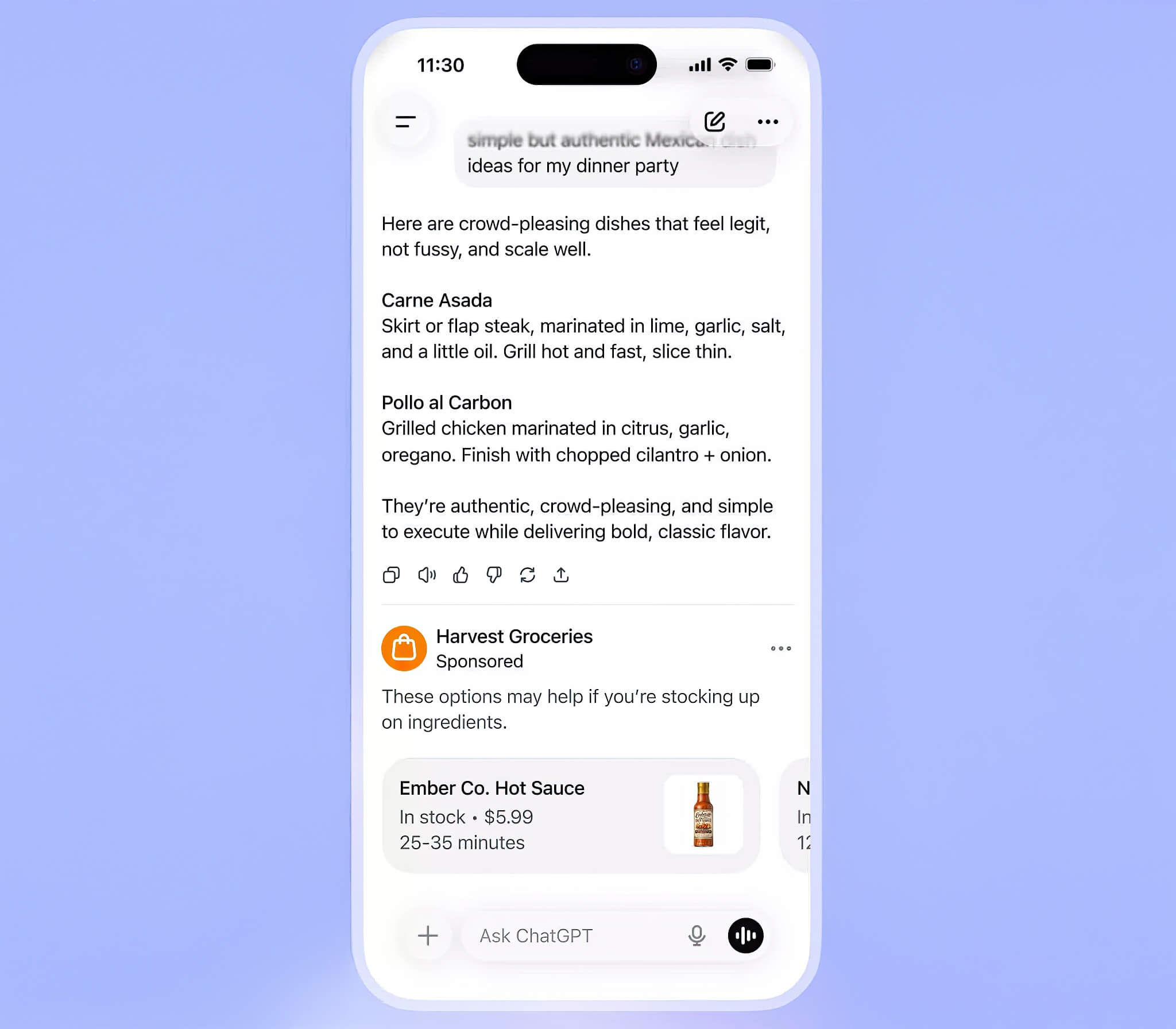 Về vị trí hiển thị, các mẫu quảng cáo thường sẽ xuất hiện ngay bên dưới câu trả lời của AI. Mặc dù các nội dung này sẽ phù hợp với ngữ cảnh của cuộc trò chuyện, nhưng OpenAI nhấn mạnh rằng chúng sẽ hoàn toàn không ảnh hưởng đến nội dung câu trả lời của chatbot. Quan trọng hơn, các nhà quảng cáo sẽ không có quyền truy cập vào nội dung các cuộc trò chuyện riêng tư của người dùng. Ví dụ, một ảnh chụp màn hình minh họa cho thấy khi người dùng hỏi ý tưởng cho bữa tiệc tối, một quảng cáo về tương ớt – được đánh dấu rõ ràng là được tài trợ – sẽ xuất hiện bên dưới các gợi ý công thức nấu ăn của ChatGPT. Trong một ví dụ khác, câu trả lời về địa danh Santa Fe được theo sau bởi quảng cáo từ một doanh nghiệp cung cấp dịch vụ lập kế hoạch du lịch đến đó. Người dùng có thể nhấn vào một nút bên dưới để mở ra một cửa sổ chatbot thứ hai nhằm yêu cầu thêm thông tin chi tiết.